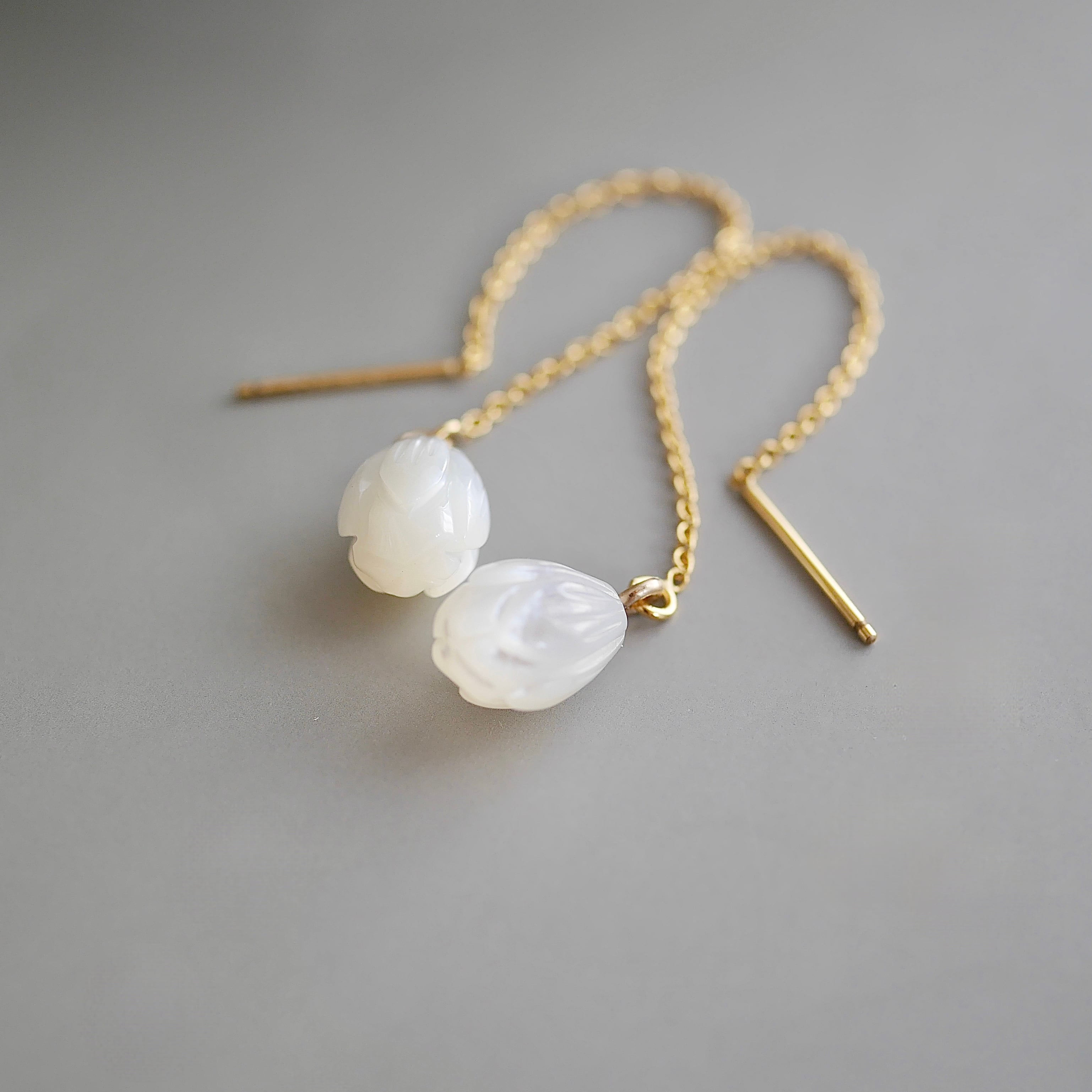 やわらかな光沢をまとった、高品質ホワイトシェルを使った蕾モチーフのピアス